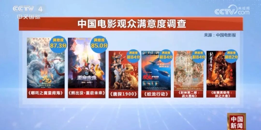 根据《中国电影报》的中国电影观众满意度调查,2025年春节档的六部影片都突破82分。其中《哪吒之魔童闹海》满意度达87.3分,《熊出没·重启未来》85.0分居第二位,《唐探1900》《蛟龙行动》《封神第二部:战火西岐》三部影片都超84分,《射雕英雄传:侠之大者》超82分。