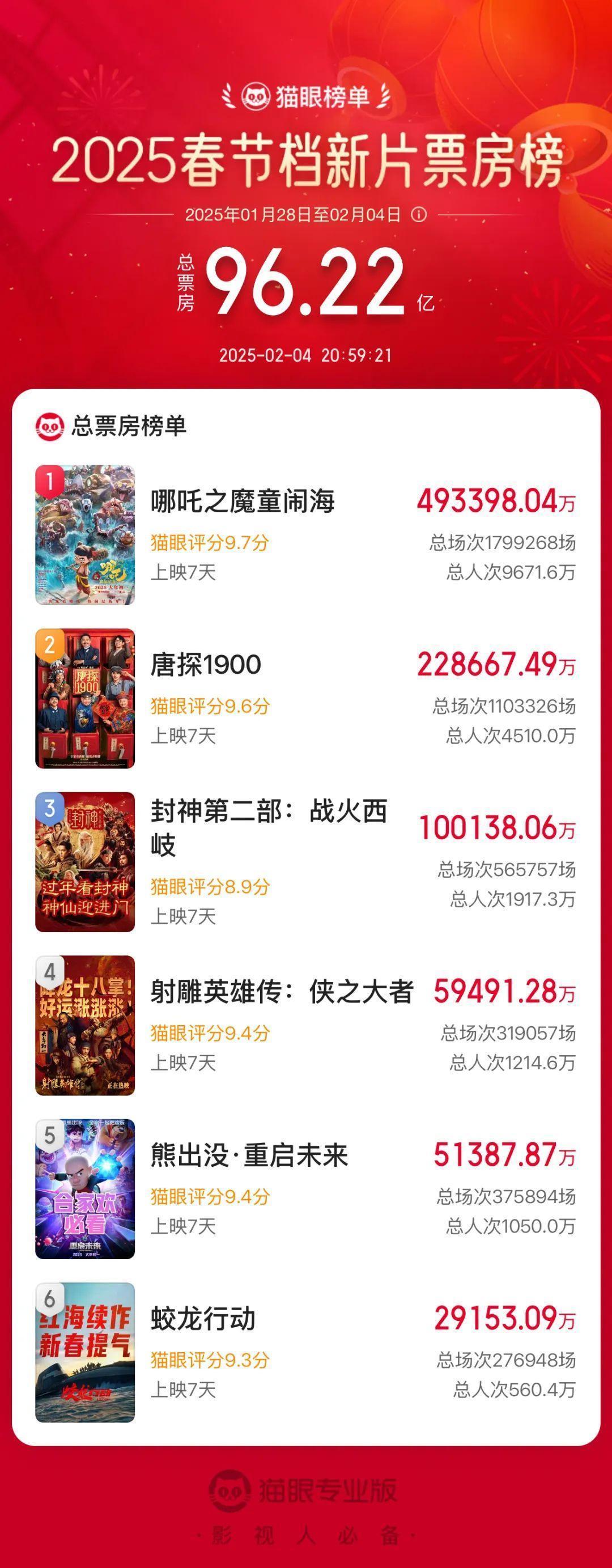 据网络平台数据,截至2月4日20时59分,2025年春节档电影票房已达到96亿元,超越2024年春节档,成为中国影史春节档总票房第一名!